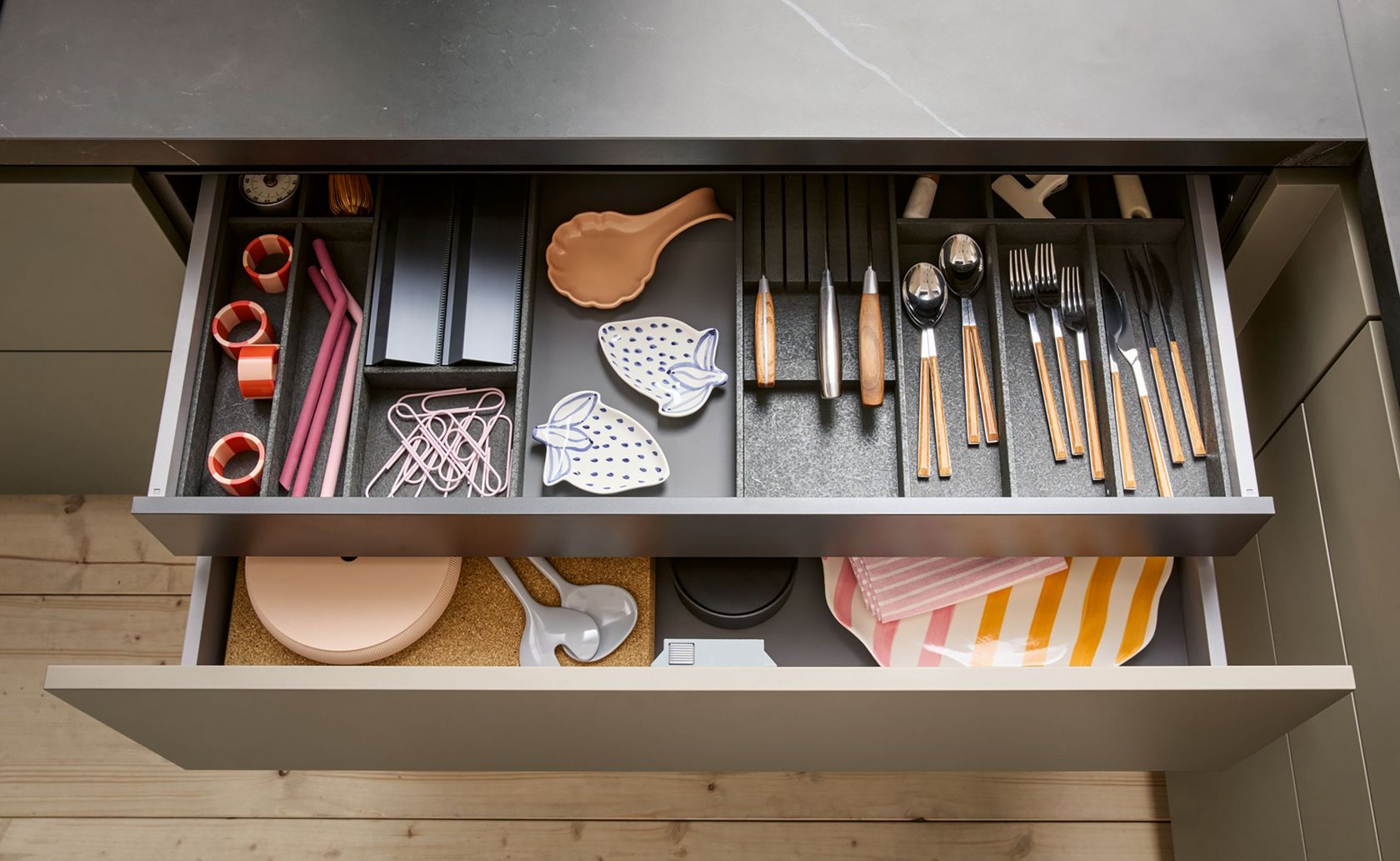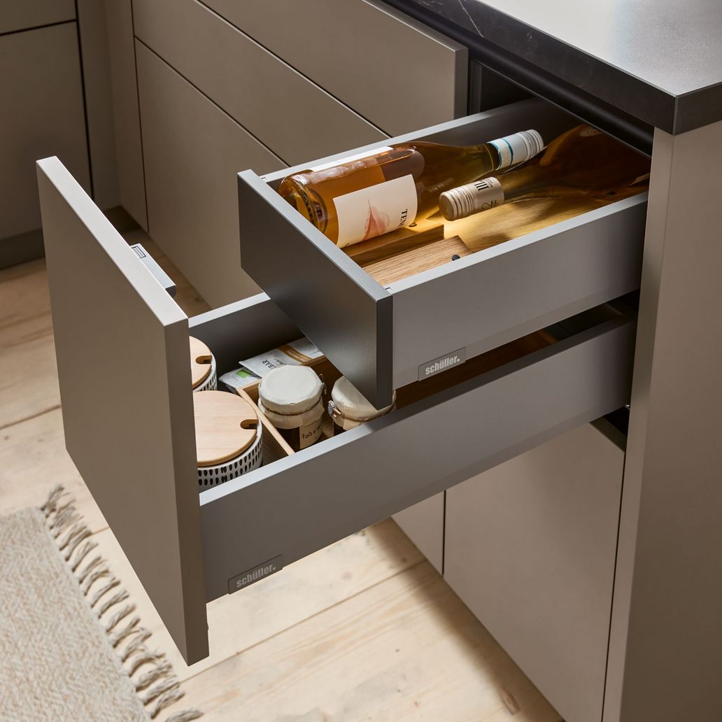 Die Fronten Matera und Matera Colour werden aus Spanplatten mit Direktbeschichtung hergestellt. Sie bestehen zu 89 % aus nachwachsenden Rohstoffen und zu 76 % aus Holz der Kreislaufwirtschaft. Zudem sind sie zu 100 % recyclingfähig. Auch optisch haben die neuen Fronten einiges zu bieten: Die matte Oberfläche mit weicher Haptik ist dank Anti-Fingerprint Eigenschaften pflegeleicht und überzeugt in mehreren Farben.