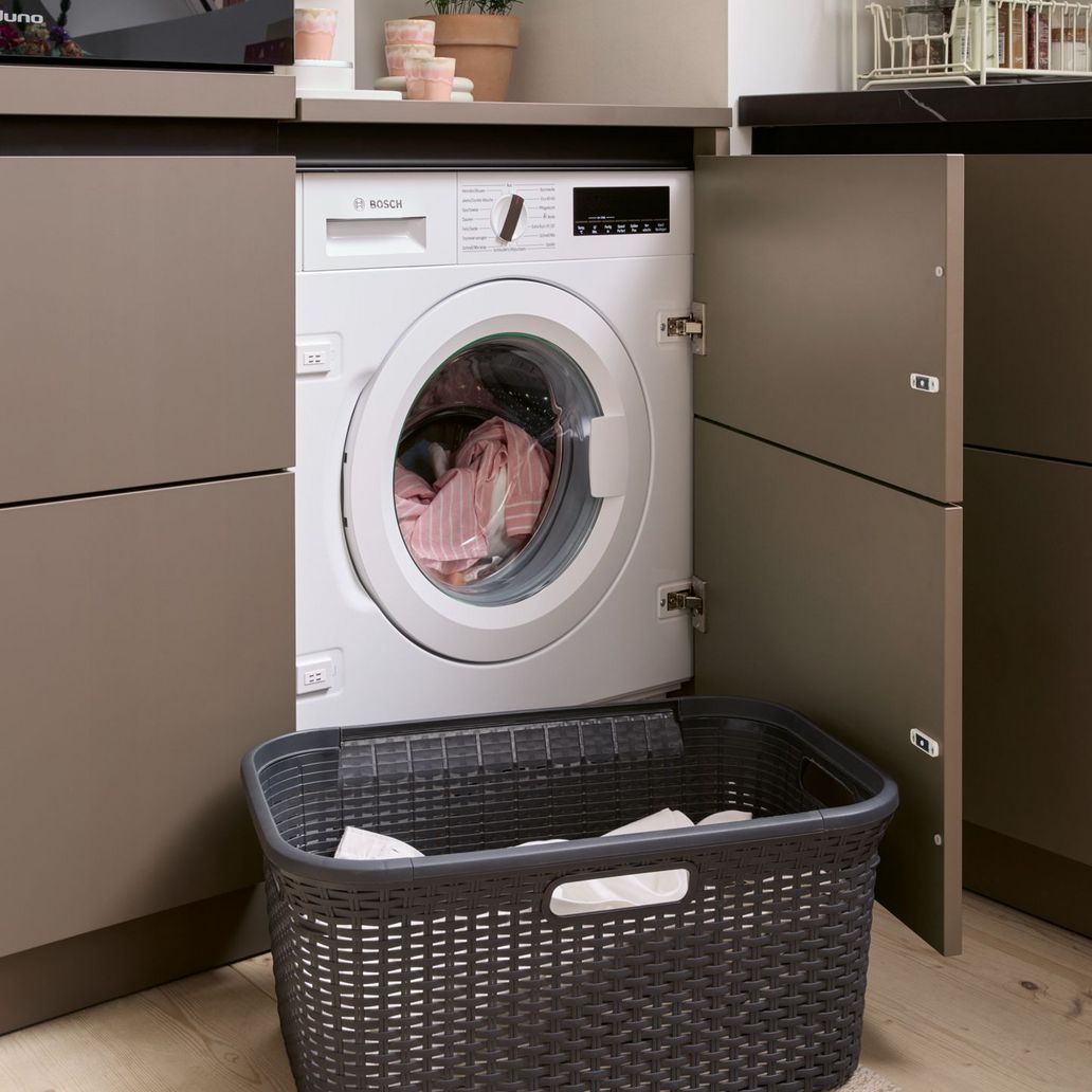 Die Waschmaschine verschwindet dezent hinter der Front und fügt sich nahtlos ins Gesamtbild ein. Gerade wenn der Wohnraum begrenzt ist oder es im Alltag praktisch sein muss, lässt sich die Waschmaschine clever in die Küche integrieren – ohne Kompromisse beim Küchendesign.