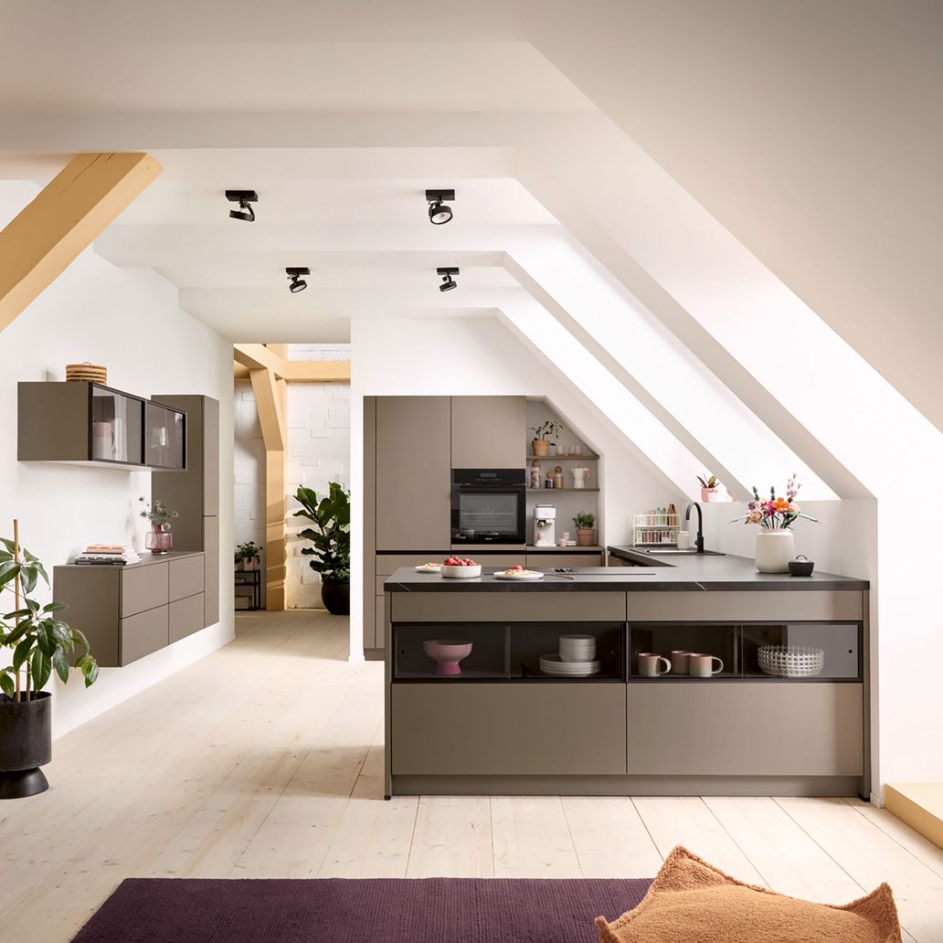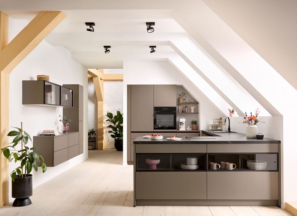 Nachhaltigkeit trifft auf Style! Eine Küche mit nachhaltigen Fronten und Anti-Fingerprint sorgt für ein umweltbewusstes Raumgefühl. Passend zum nachhaltigen Frontmaterial: Innenausstattung aus OrganiQ mit Hanf und Kenaf.
