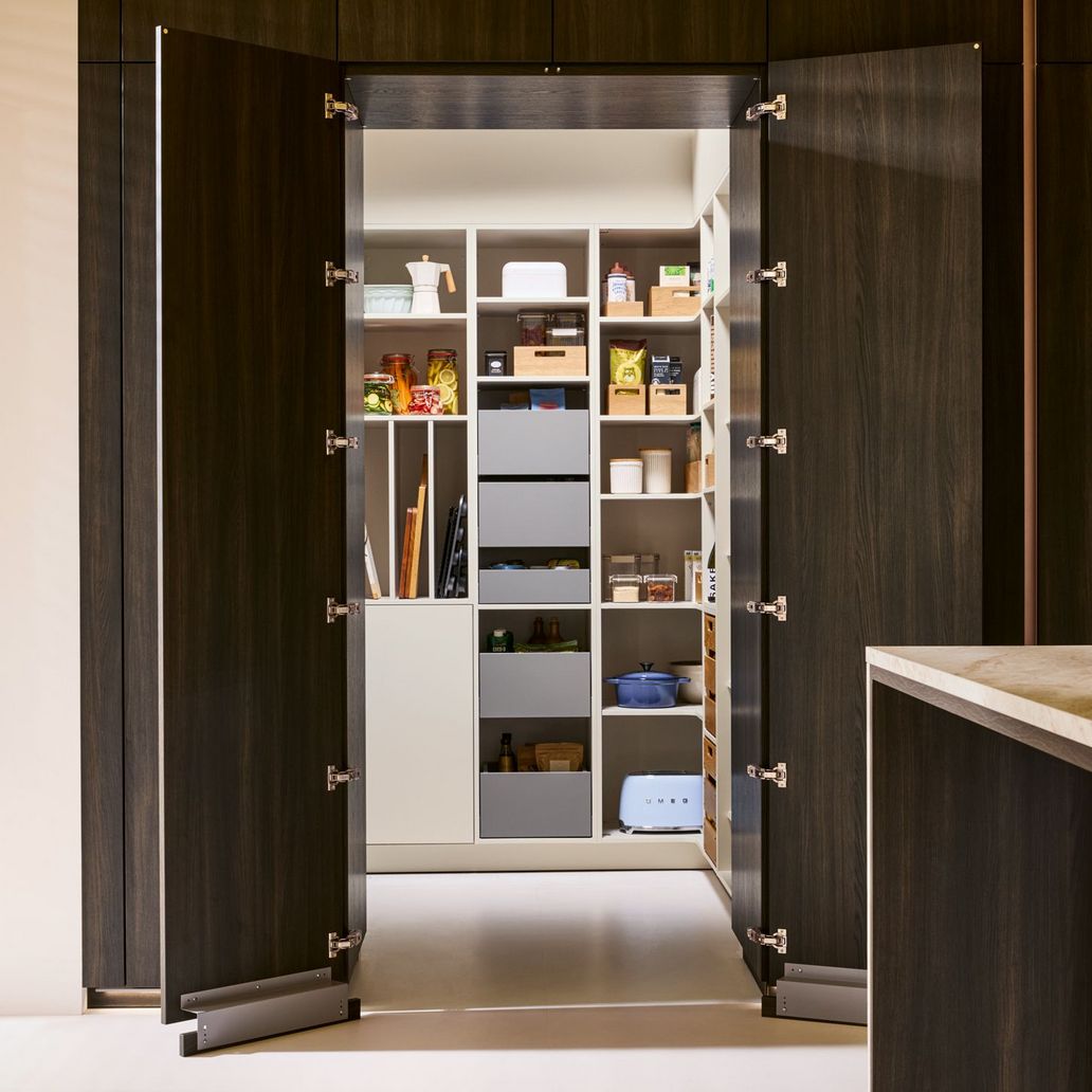 Die zwei Flügel lassen sich vollständig öffnen und schaffen einen großzügigen Durchgang in den Vorrats- oder Hauswirtschaftsraum. So werden noch mehr Möglichkeiten geschaffen, ein harmonisches Gesamtbild in der Hochschrankzeile zu erzeugen.