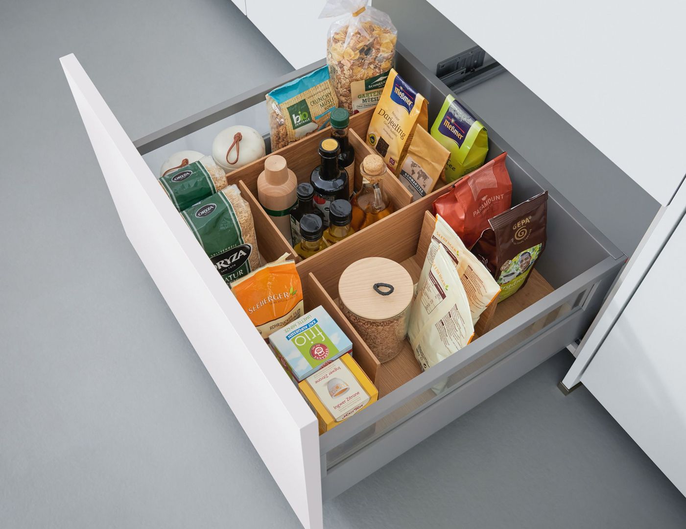 Auch wenn das Kochen selbst oft eine gewisse Improvisationskunst erfordert – bei der Aufbewahrung der Küchenutensilien ist Struktur und Übersicht gefragt. Damit alles seinen festen Platz hat und Sie immer sofort das richtige zur Hand haben, bieten wir maßgeschneiderte Einsätze und individuelle Ausstattungselemente für unsere Schübe, Auszüge und Schränke.