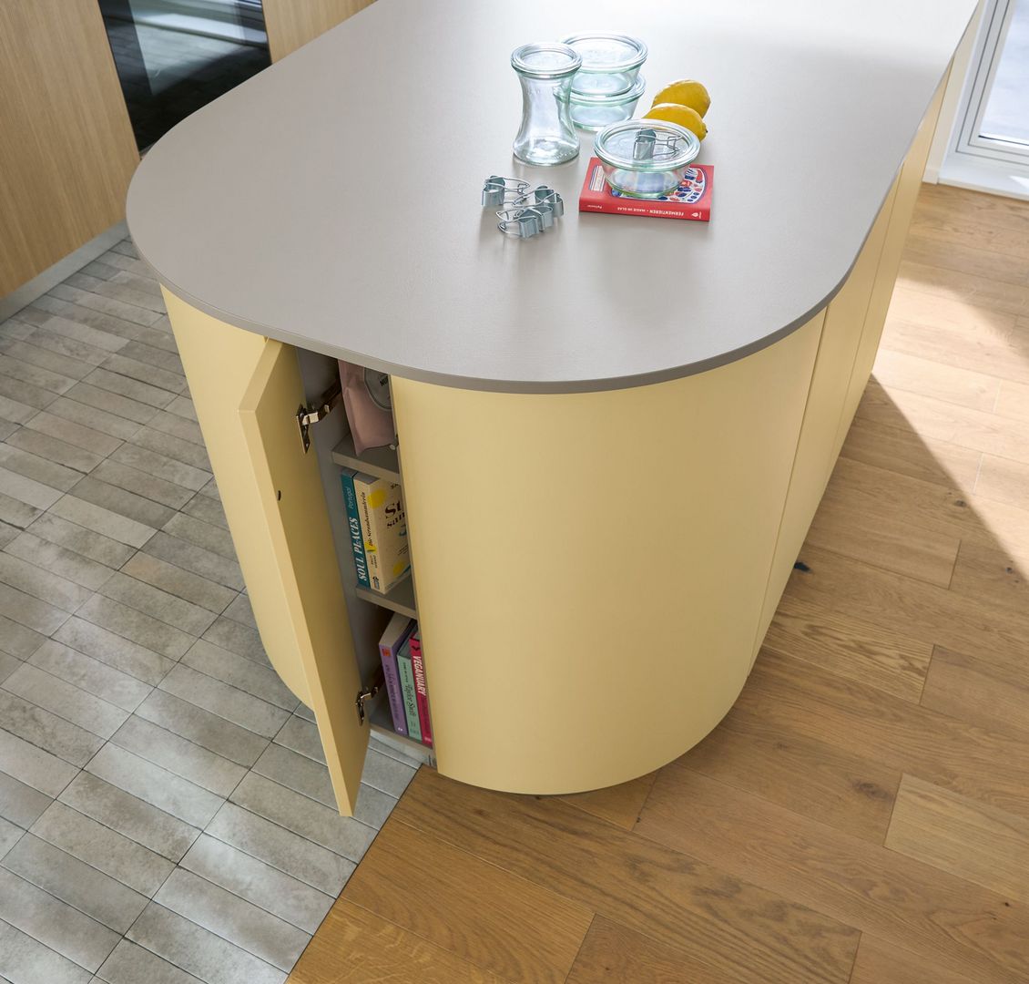 Sonnig-zarte Oberschränke mit abgerundetem Abschluss. Diese Wohlfühl-Kombination sorgt auch bei wenig Raum und Budget für viel Begeisterung: Die eleganten Rondoschränke liefern mit ihrer platzsparenden Form überraschend viel Stauraum, sodass die Kochinsel harmonisch ins Gesamtbild passt.