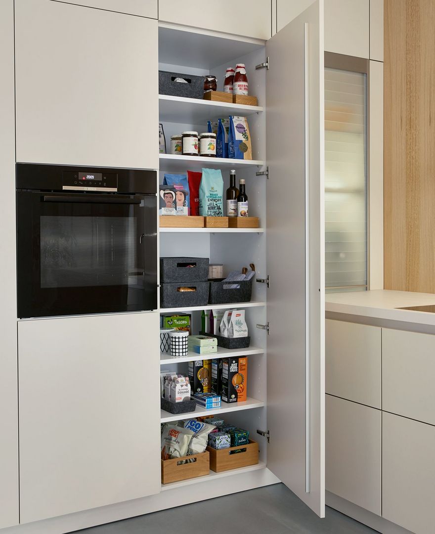 Die Matera Fronten sind recyclingfähig und bieten in der Unterschrankzeile dank der neuen SingleX Einteilung ein minimalistisches Bild mit maximalem Wert. Die unteren Schübe lassen sich ergonomisch per Tip-On öffnen, während die oberen über ein dezentes Griffmuldenprofil unter der Arbeitsplatte verfügen.