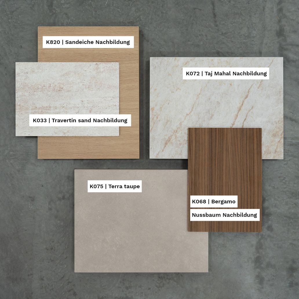 Edel wohnen wie in Dubai mit Taj Mahal Nachbildung oder warm und geborgen fühlen wie in Norwegen mit Bergamo Nussbaum Nachbildung. Mit Sandeiche Nachbildung wird man in japanische Häuser mit Trennwänden aus Papier entführt während Travertin sand Nachbildung in südeuropäisches Urlaubsgefühl versetzt. Terra taupe mit einer Mischung aus Grau und Beige verleiht dem Raum Ruhe und Fokusgefühl.