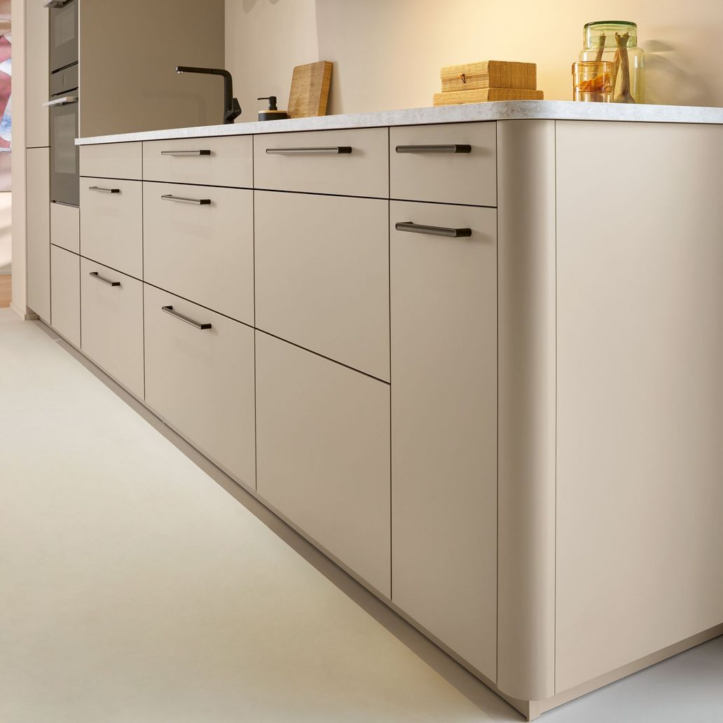 Die neuen abgerundeten Abschlüsse für Zeilen und Inseln verleihen minimalistischen Küchenplanungen eine moderne Raffinesse. Sie brechen bewusst mit der Strenge geradliniger Formen und schaffen eine harmonische Verbindung zwischen Küche und Wohnraum.