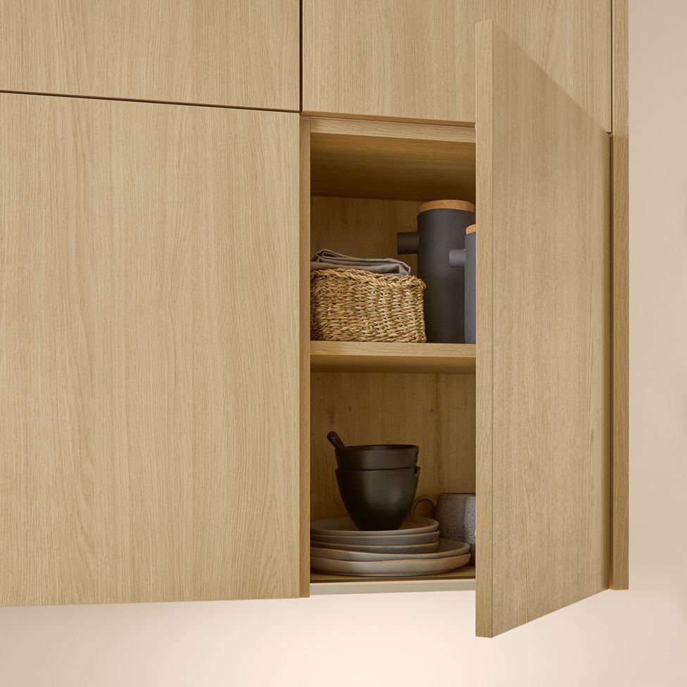 Mit der neuen Korpusinnenfarbe Sandeiche Nachbildung im Programm CREMONA wird der Anspruch an gestalterische Harmonie unterstrichen. Der Korpus ist innen wie außen in der harmonischen Holzoptik gestaltet und sorgt so für ein rundum stimmiges Gesamtbild. Offene Schränke und Regale fügen sich nahtlos in die Planung ein und wirken wie aus einem Guss.