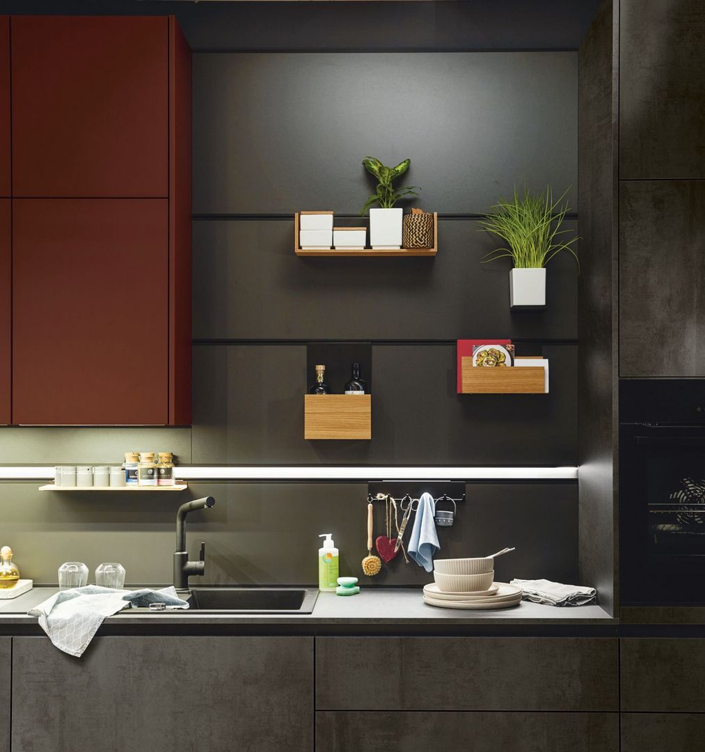 The recess panel with oak elements provides additional storage space; it is visually appealing and provides quick access to kitchen aids.