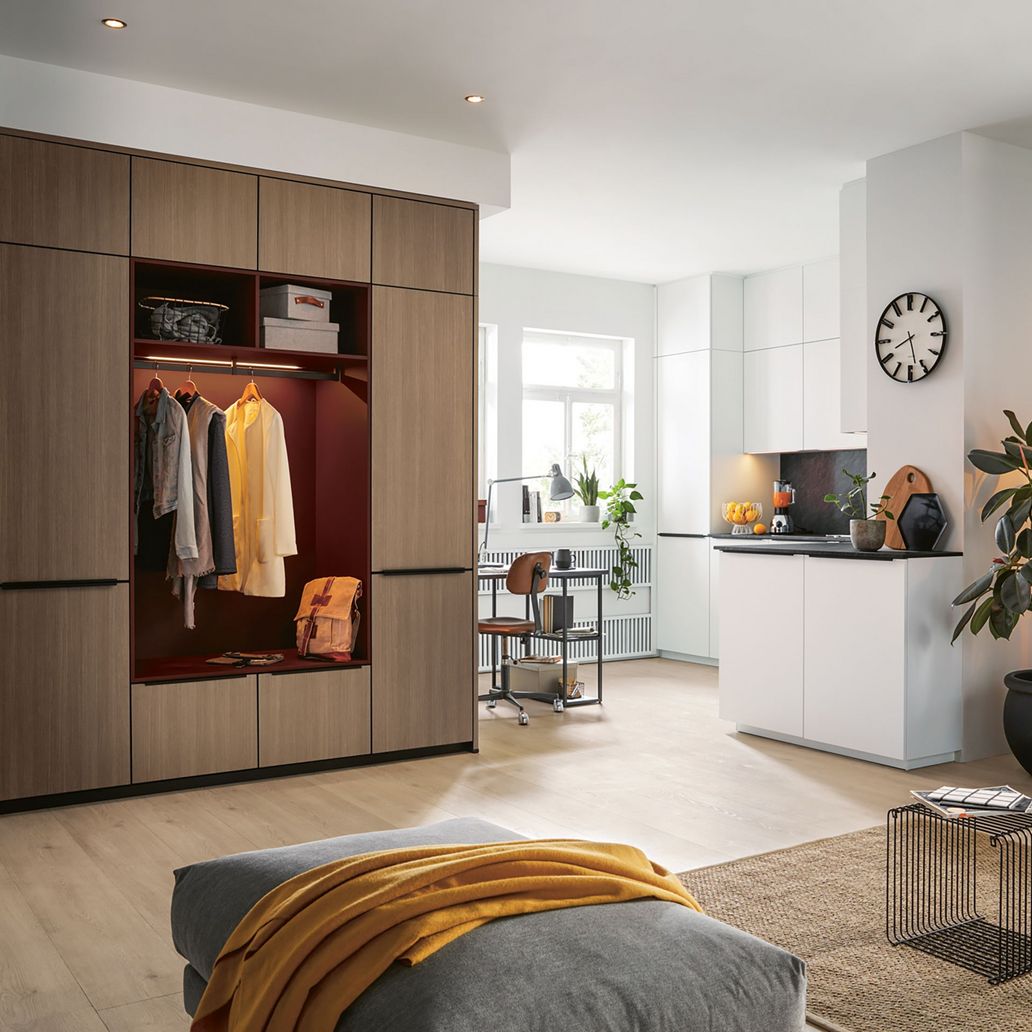 Multifunctionele meubels passen zich aan verschillende behoeften aan en kunnen uitstekend worden geïntegreerd in een open woonconcept. Zo kan de ruimte efficiënt en flexibel worden benut. Regaalen met geïntegreerde meubels, een eettafel die naar wens kan worden uitgetrokken en slimme opbergmogelijkheden in het kookeiland – alles is vanuit een holistisch perspectief uitgedacht en helpt om de verschillende ruimtes en functies met elkaar te verbinden.