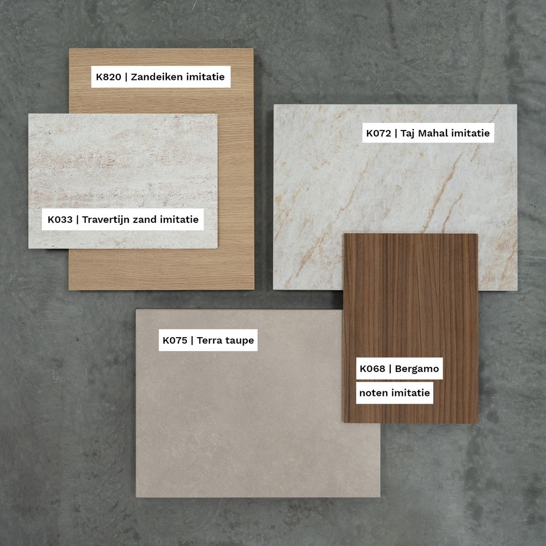 Wonen in luxe zoals in Dubai met Taj Mahal imitatie of je warm en geborgen voelen zoals in Noorwegen met Bergamo noten imitatie. Met Zandeiken imitatie word je meegenomen naar Japanse huizen met scheidingswanden van papier, terwijl Travertin zand imitatie je een Zuid-Europees vakantiegevoel geeft. Terra taupe met een mix van grijs en beige geeft de ruimte rust en een gevoel van focus.